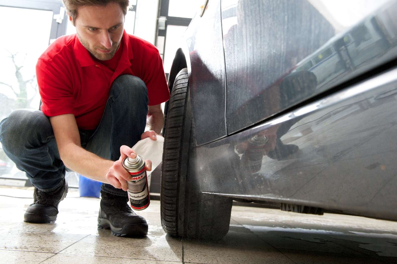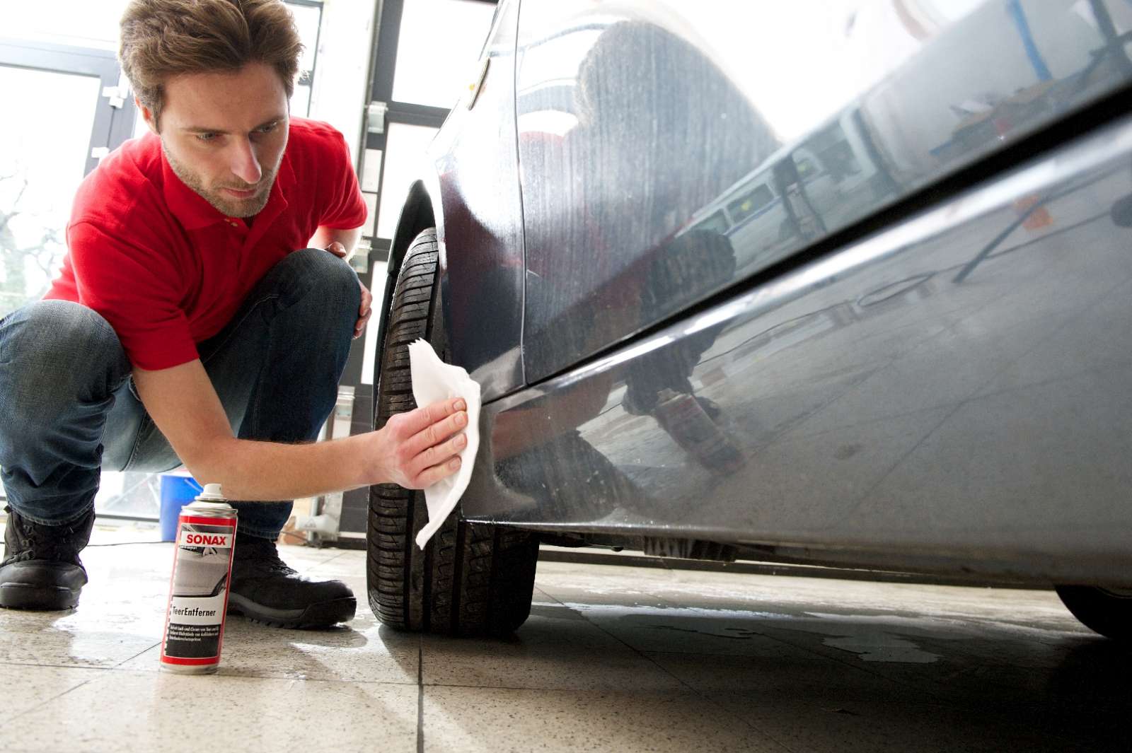 Verschmutzungen mit SONAX TeerEntferner einsprühen und ca
