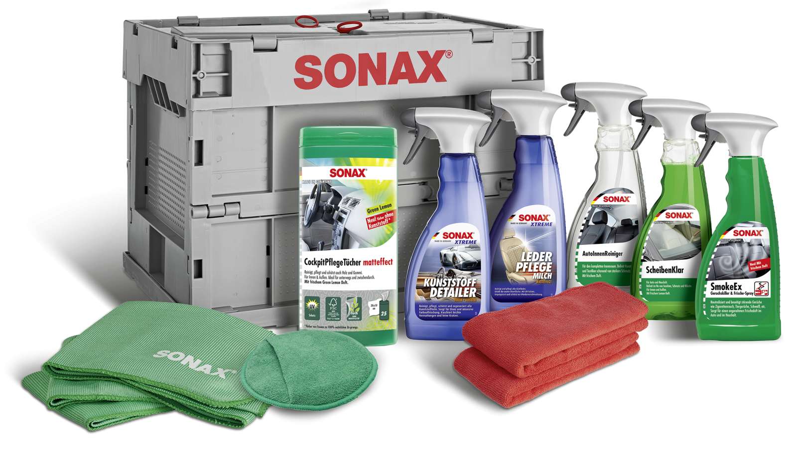 SONAX Pflegebox Inhalt: 1 x 03212000 AutoInnenReiniger, 1 x 03382410 ScheibenKlar, 1 x 02922410 SmokeEx, 1 x 02542410 XTREME LederPflegeMilch Matteffect, 1 x 02552410 Xtreme KunststoffDetailer, 1 x 04509410 GlasFinishTuch, 1 x 04172000 MicrofaserPflegePad, 04162410 MicrofaserTücher, 1 x 04128000 CockpitPflege Tücher Matteffect