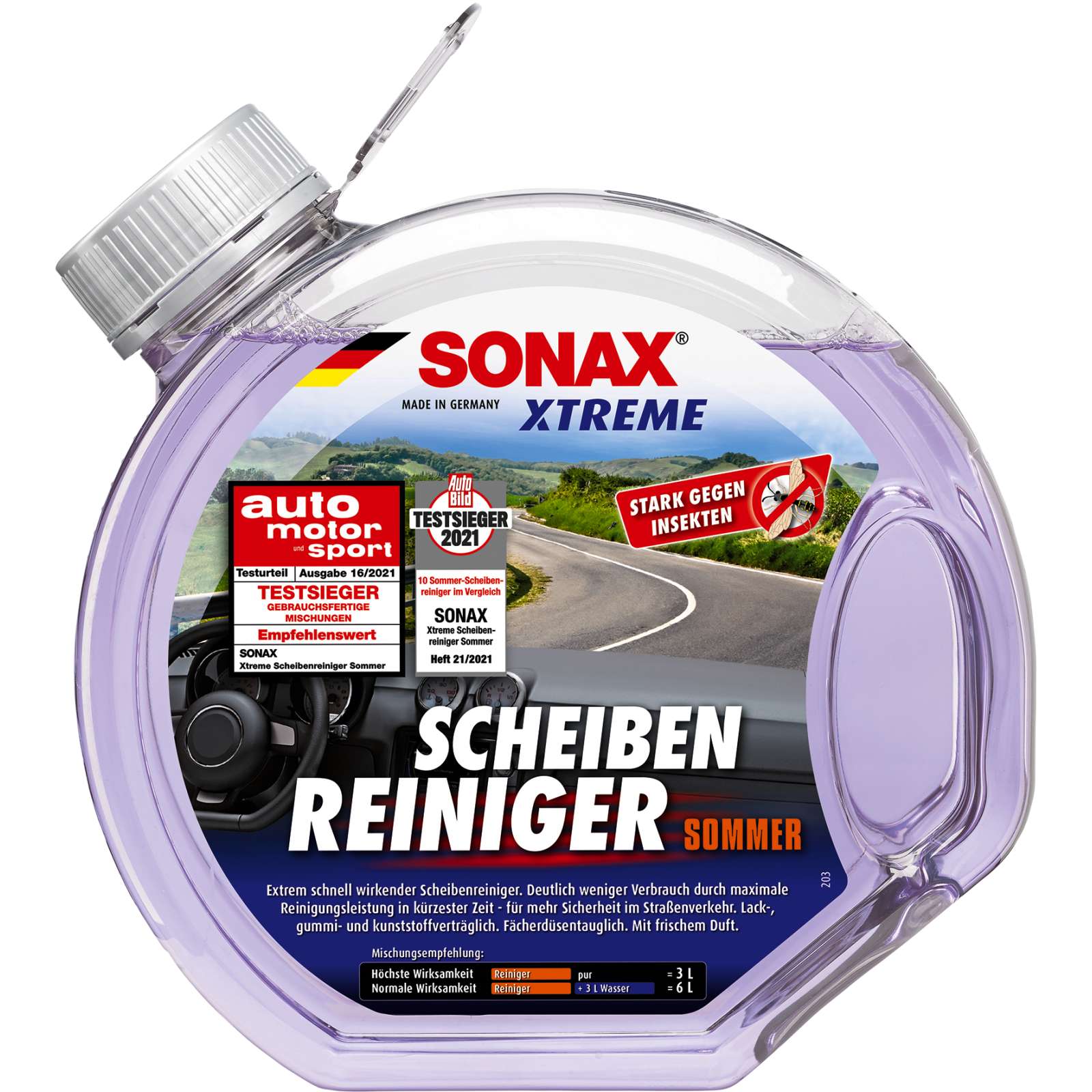 Extrem schnell wirkender Scheibenreiniger für die Scheibenwaschanlage im Sommer. Bestmögliche Reinigungsleistung ohne Streifen- und Schlierenbildung - selbst bei Insektenschmutz . Deutlich weniger Verbrauch durch maximale Reinigungsleistung in kürzester Zeit - für mehr Sicherheit im Straßenverkehr. Lack-, gummi- und kunststoffverträglich. Fächerdüsentauglich. Mit frischem Duft. Gebrauchsfertig und mischbar: => Für höchste Wirksamkeit den Reiniger pur einfüllen. => Für normale Wirksamkeit den Reiniger 1:1 mit Wasser mischen.