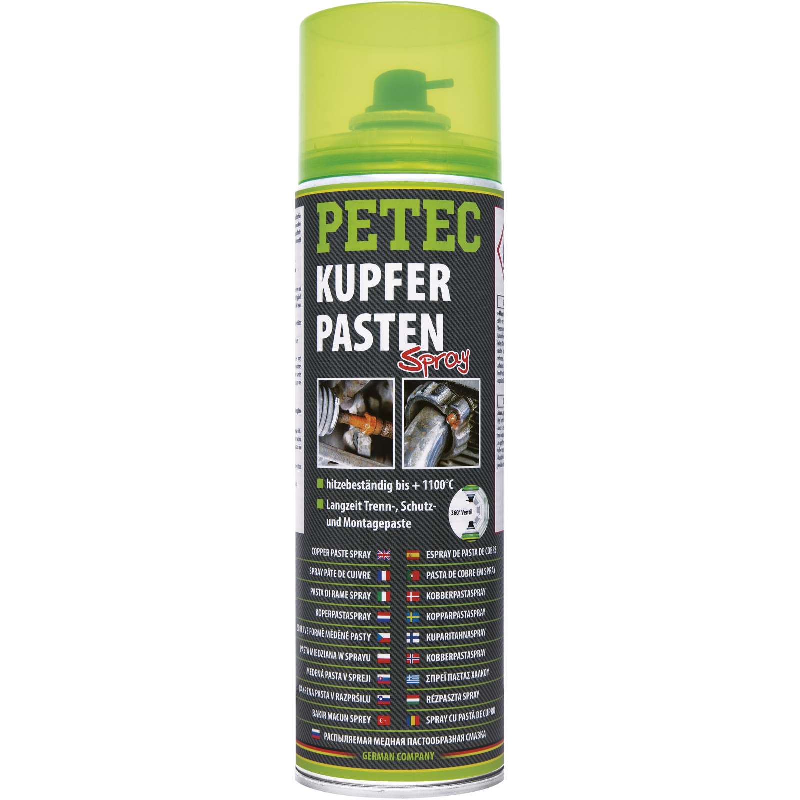 • PETEC Kupferpasten-Spray zur Langzeitschmierung von Schraub- und Fügeverbindungen (Rohr-, Flansch- und Armaturenverschraubungen), die hohen Temperaturen und korrosiven Einflüssen ausgesetzt sind, wie zum Beispiel Lambdasonde, Glühkerze, Zündkerze, Abgasrückführung, Turbolader, Dieselpartikelfilter, Endschalldämpfer, Bremsen und Zubehör, Krümmer-, Auspuffrohr-, Motor- sowie Brennkammerverschraubungen